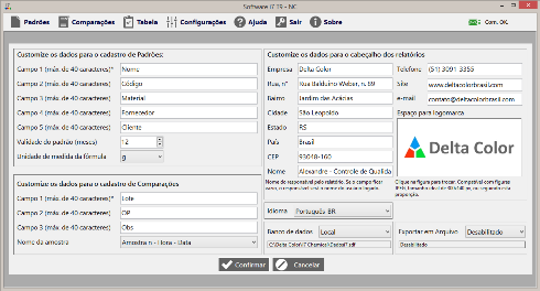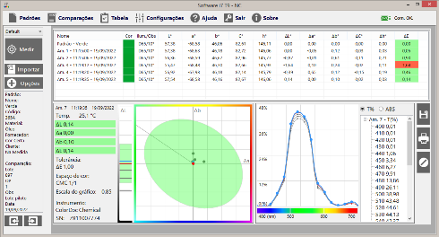 | Iluminantes / Observador | A, B, C, D50, D55, D65, D75, E, F2(CWF), F7(DLF), F11(TL84) / 2° e 10° |